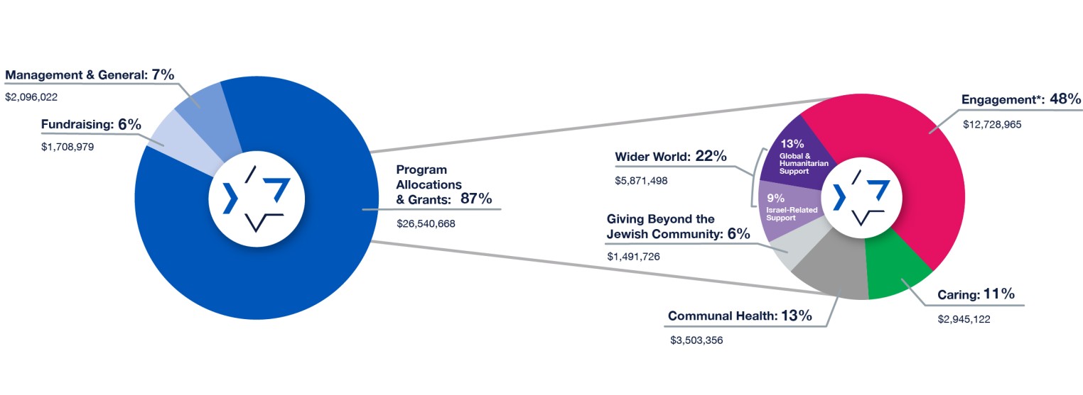 The Federation’s financial framework has grown dramatically over the past decade. Today it includes funding from multiple sources including our Annual Campaign, Federation-run donor-advised funds, donor-directed gifts, legacy giving, and corporate and foundation grants. Our goal is to allocate at least 85 cents of every dollar directly to programs and grants, and we consistently exceed it—averaging 87 cents over five years*.