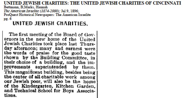 Cincinnati's Jewish Federation is the second oldest Jewish Federation in North America. Founded in 1896 as the United Jewish Charities, it set up a combined city-wide campaign for funds, bringing eight agencies under one central administration with the objective of “helping the poor respect themselves and become self-sustaining through employment.”