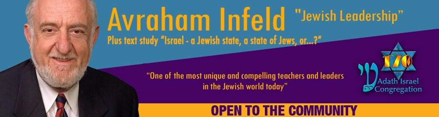Please join us at Adath Israel Congregation Saturday morning/afternoon following services, March 25 with Avraham Infeld for a sermon on “Jewish Leadership: can Biblical Images serve to enrich and serve as models for Jewish Leaders in the 21st. Century.” It will be followed by a Kiddush Luncheon and a text study exploring “Israel - a Jewish state, a state of Jews, or...?: A reflective and Contemporary Study of Israel's Declaration of Independence”. Open to the community. Part of Adath Israel's 170th Anniversary Celebration.