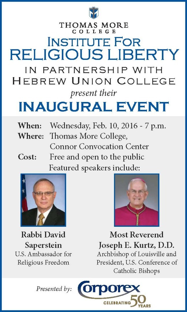 The Institute will sponsor an Inaugural public program featuring two prominent thought leaders who will discuss the American concept of religious freedom. The Feb. 10, 2016 program at Thomas More College (7:00 p.m.) will feature the President of the United States Conference of Bishops, the Most Reverend Joseph E. Kurtz, D.D., Archbishop of Louisville, and the U.S. Ambassador for Religious Freedom, Rabbi David Saperstein, as speakers. The event is FREE and open to the public.