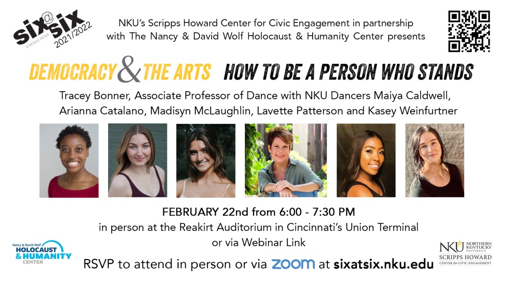 Northern Kentucky University's 2021-2022 season of the Six@Six Lecture Series is focused on the American democracy. Their season’s third “lecture” is not a traditional lecture. Rather, NKU Dance Professor Tracey Bonner will talk about the importance of the arts in raising awareness about civil rights and other issues in our democracy. She’ll be joined by NKU dancers Maiya Caldwell, Arianna Catalno, Madisyn McLaughlin, Lavette Patterson and Kasey Weinfurtner who will interpret Bonner’s talk through choreography.