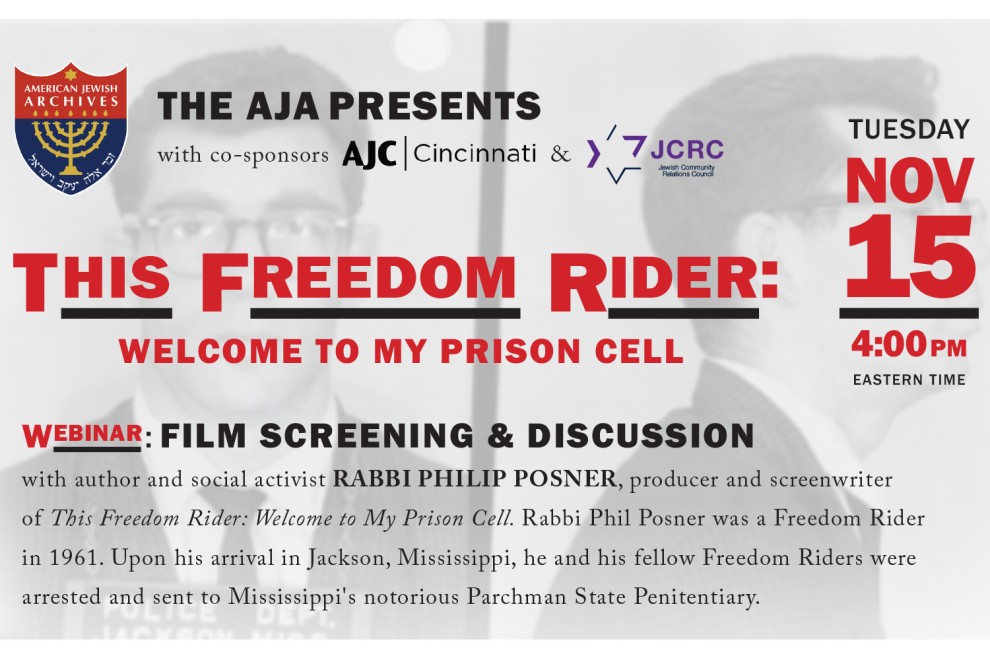 Join us as we explore this episode from our past through the lens of a brand new documentary film that examines Rabbi Posner's story. After viewing the 35-minute film, Dr. Gary P. Zola, Executive Director of the AJA, will engage in dialogue with Rabbi Posner about his experiences during that tumultuous time in our nation's history. Participants will also have an opportunity to see some of the AJA's remarkable holdings that document the history of Jewish Freedom Riders.