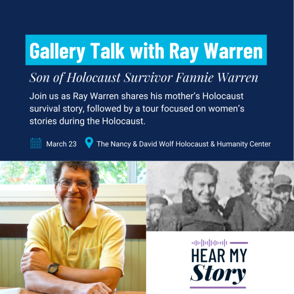 Join us for a gallery talk and tour celebrating Women’s History Month on March 23. The featured speaker will be Ray Warren. Ray tells the story of his mother, Fannie Warren. Fannie was born in the small town of Zwolen, Poland and was one of five children born to Rubin and Mindel Hofman. She was married shortly after the war began in 1940. After working in slave labor camps, she was finally liberated by the British at the Bergen-Belsen concentration camp. Of her family, only she and her brother, Chaim, survived. Ray has a Ph.D. in Biology and is retired from Procter and Gamble. He is a founding member of the Cincinnati Combined Generations of the Holocaust, a predecessor organization to the Nancy & David Wolf Holocaust & Humanity Center.