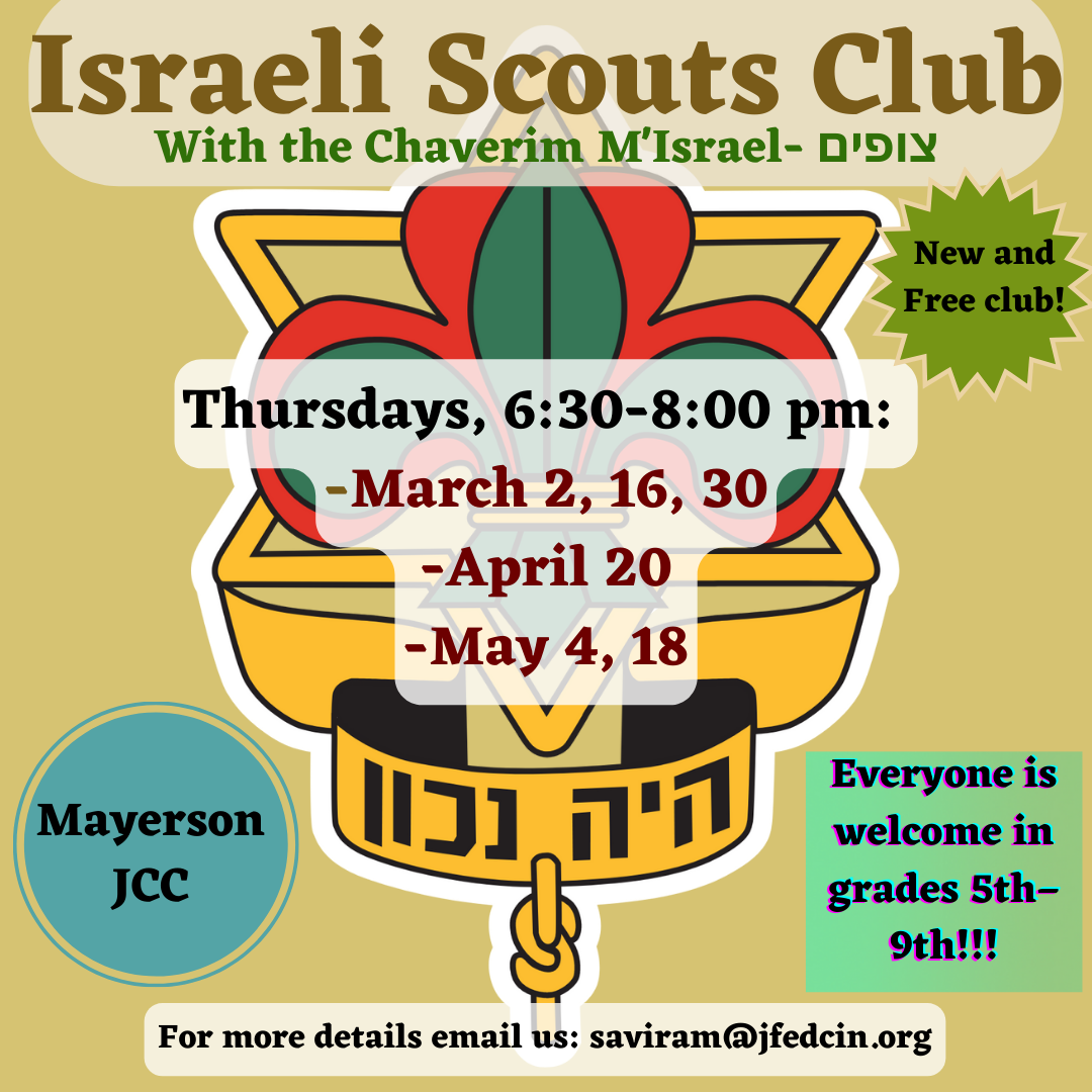 This free club will take place on select Thursdays, 6:30-8:00 pm at the Mayerson JCC. Open to students in 5th-9th grade. No prior scout knowledge is required.