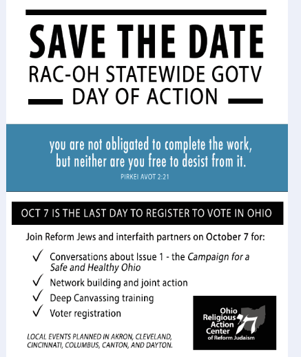 Join Reform Ohio, the Jewish Community Relations Council and numerous other Cincinnati community, faith and civic organizations for a day of voter engagement, education and registration. We will gather together for a brief voter engagement training and then head out in teams to various neighborhoods to to voter registration and education.