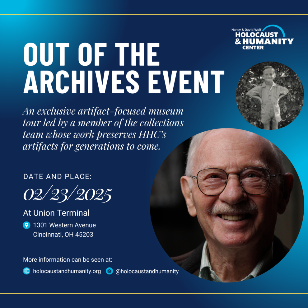 The Holocaust & Humanity Center’s archive is home to over 10,000 precious treasures. Each of these artifacts holds a powerful story about a local eyewitness to the Holocaust. Join us for “Out of the Archives,” an exclusive artifact-focused museum tour led by a member of the collections team whose work preserves HHC’s artifacts for generations to come. This tour will focus on the story of Henry Fenichel, a local Cincinnati Holocaust survivor. Participants will see artifacts that have never been exhibited before and they can interact with Henry’s newly launched Dimensions in Testimony biography.