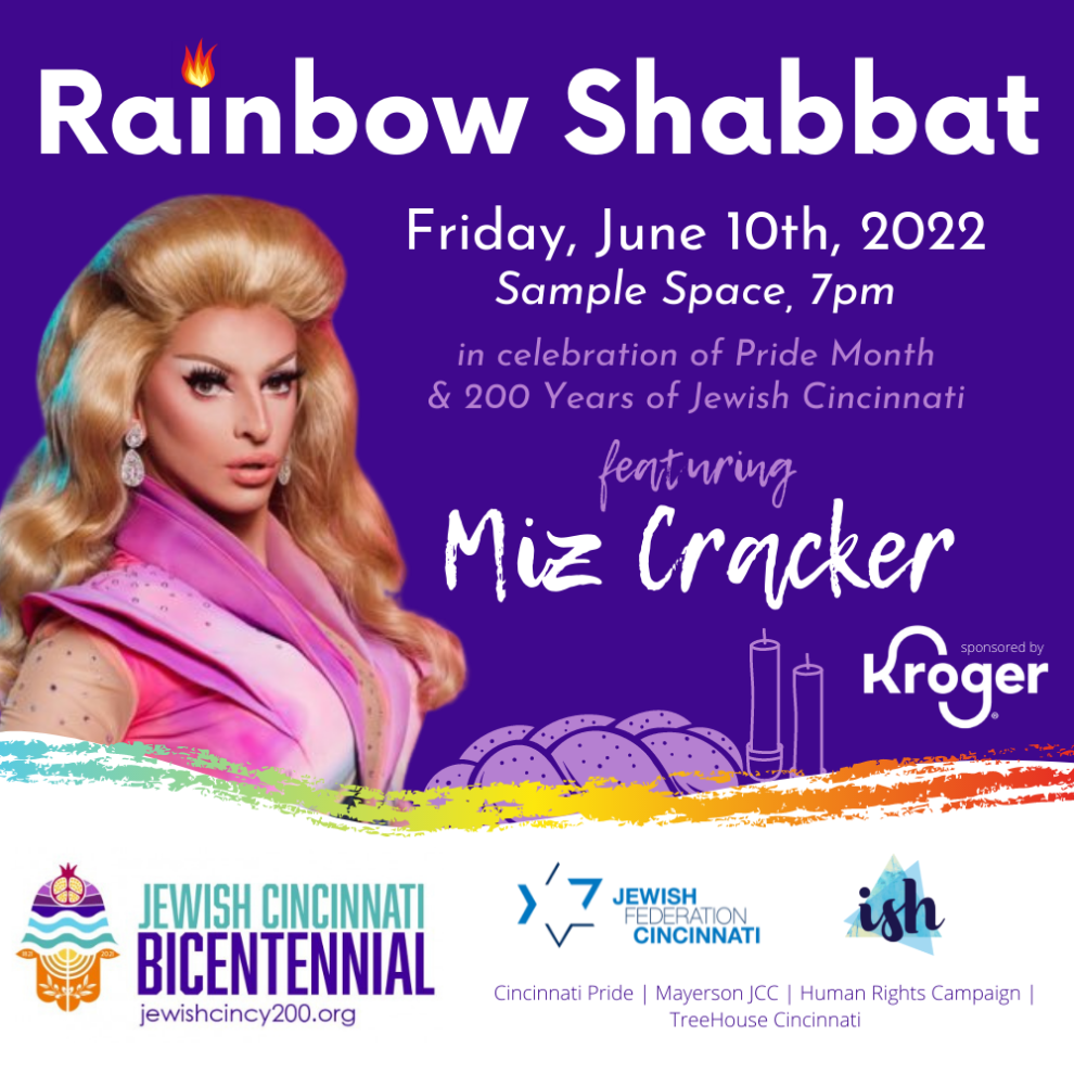 Join the Cincinnati Jewish and LGBTQ+ communities for a night of Shabbat, food, connection, conversation, and celebration! Hosted by Miz Cracker, star of Rupaul's Drag Race Season 10 and All-Stars 5! This evening is an opportunity to highlight the Jewish Sabbath–sharing cultural, spiritual, and culinary traditions in a non-traditional way.