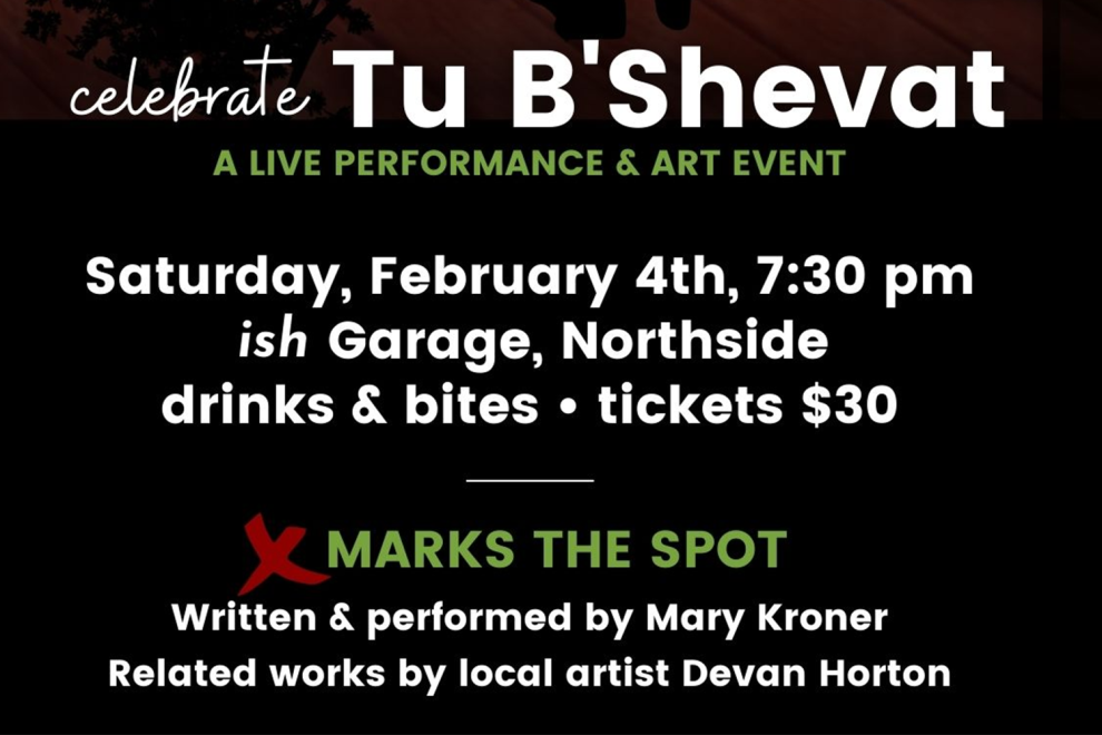 On Erev Tu B'Shevat (Saturday, February 4th), Shomrei Olam is bringing together two local artists to engage our senses for the new year of trees. Mary Kroner, a local entrepreneur, activist, and playwright will perform her very own – X Marks the Spot, a whimsical take on our place in the world. Local artist, Devan Horton, brings her unique work on canvas depicting what we leave behind. Together, they broaden our sense of our place in the world and the work that lies before us. The evening is paired with Tu B'Shevat food and drinks for a full immersion.