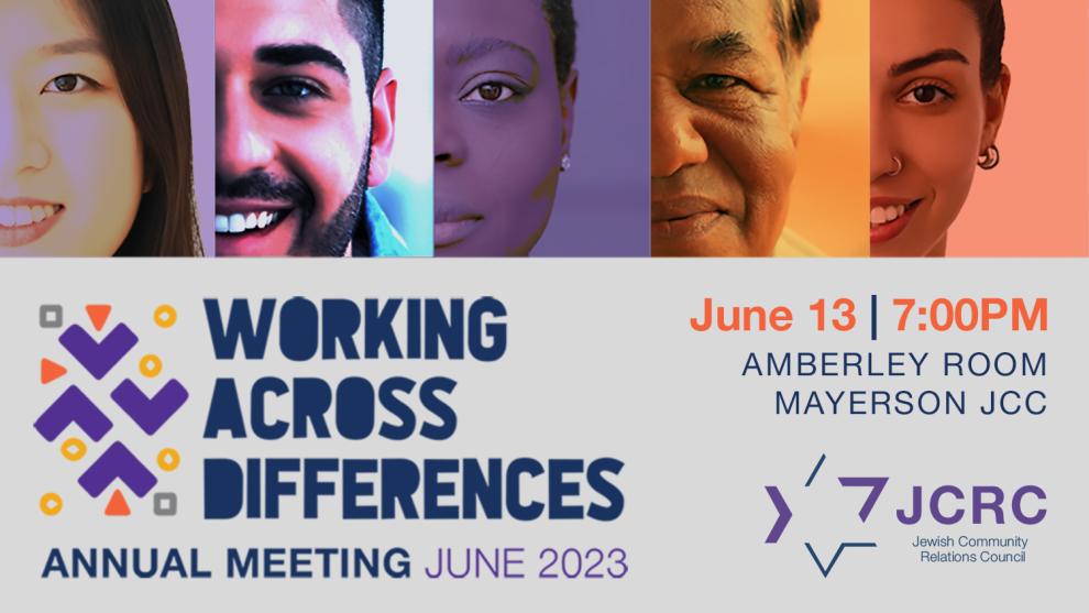 Please join us for the JCRC 2023 ANNUAL MEETING: Working Across Differences. We will celebrate this year's accomplishments, explore today's challenges, and look forward to a promising future. Be there for exciting news about the upcoming Leaders in Light Institute, the election of new JCRC board members, and an in-depth discussion about Israel, featuring an ideologically diverse group of expert panelists from around the country.