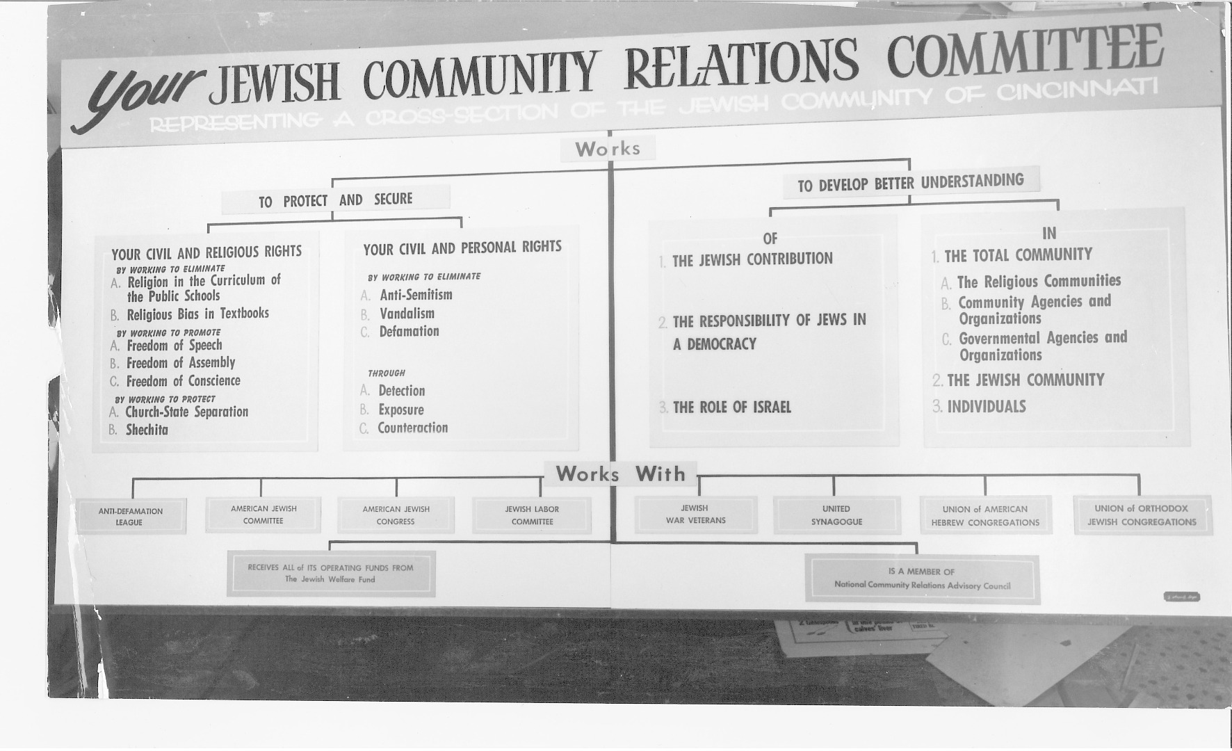 Since the founding of JCRC, its leadership has worked with AJA to preserve thousands of rich historical JCRC documents and materials. The collection consists of correspondence, reports, news releases, clippings, photographs, and other materials relating to the activities of the JCRC from 1934-2007. The largest sections of the collection include materials on antisemitism and the radical right, religion, church and state issues, religion in the public schools, civil rights, Israel, the National Community Relations Advisory Council, and Soviet Jewry. There are also materials on Nazism and the Holocaust, and correspondence with Jewish and non-Jewish organizations, both national and local. Included are records of the JCRC's involvement in, and reaction to, national and local issues and events. The collection also includes financial and administrative records of the Cincinnati JCRC.