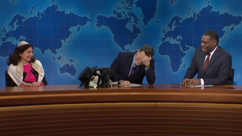 This last Saturday, during their joke swap, they invited on someone they called an “actual practicing rabbi.” (For what it’s worth, it wasn't just a stunt: the woman they invited on, Jill Hausman, practices as a rabbi in Manhattan.) Hausman’s job on the show was implicit but clear: to sit stone-faced as Jost and Che uttered one cringeworthy joke after another. That's precisely what happened, as they shared jokes about Harvey Weinstein, Jost’s wife, and even made use of a Hasid puppet.